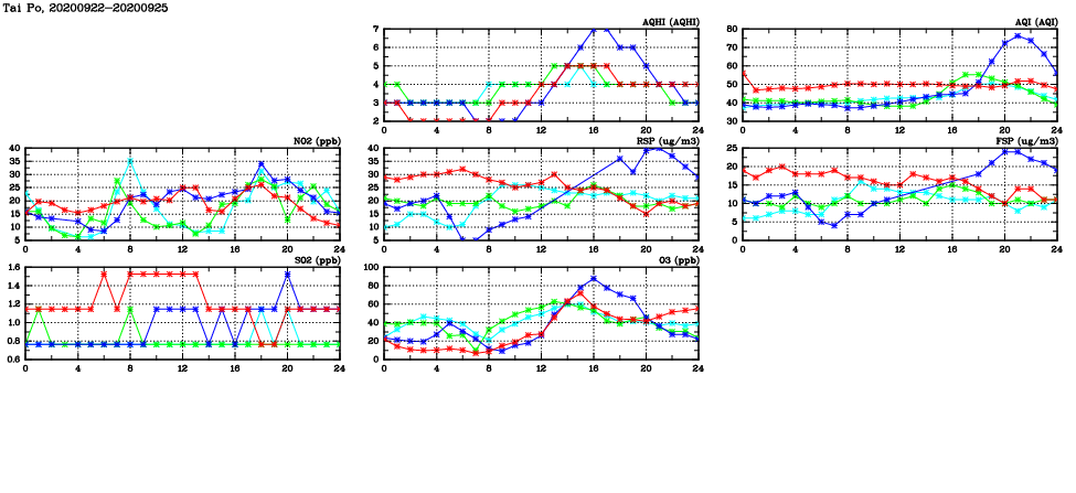 | Air Quality Data Time Series in Tai Po (2020/09/25) | ( Line colors: Day -3 Day -2 Day -1 Current day ) | 2D Map Current AQHI |