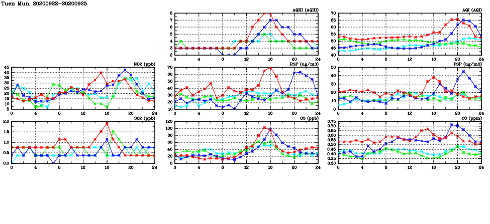 | Air Quality Data Time Series in Tuen Mun (2020/09/25) | ( Line colors: Day -3 Day -2 Day -1 Current day ) | 2D Map Current AQHI |