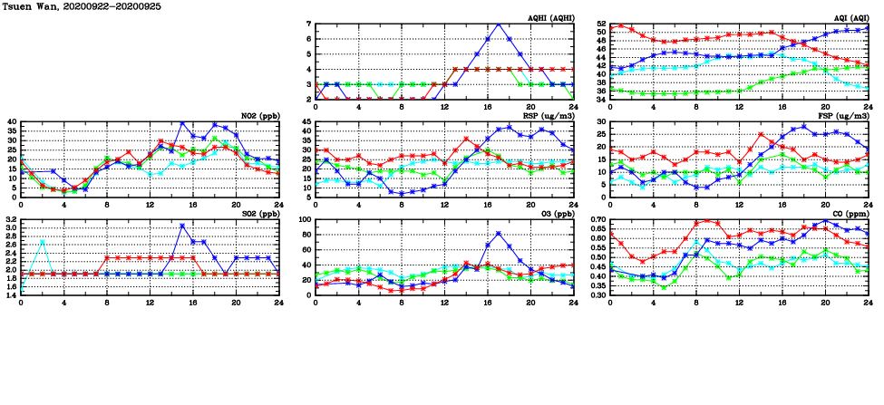 | Air Quality Data Time Series in Tsuen Wan (2020/09/25) | ( Line colors: Day -3 Day -2 Day -1 Current day ) | 2D Map Current AQHI |