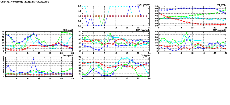 | Air Quality Data Time Series in Central/Western (2021/02/24) | ( Line colors: Day -3 Day -2 Day -1 Current day ) | 2D Map Current AQHI |