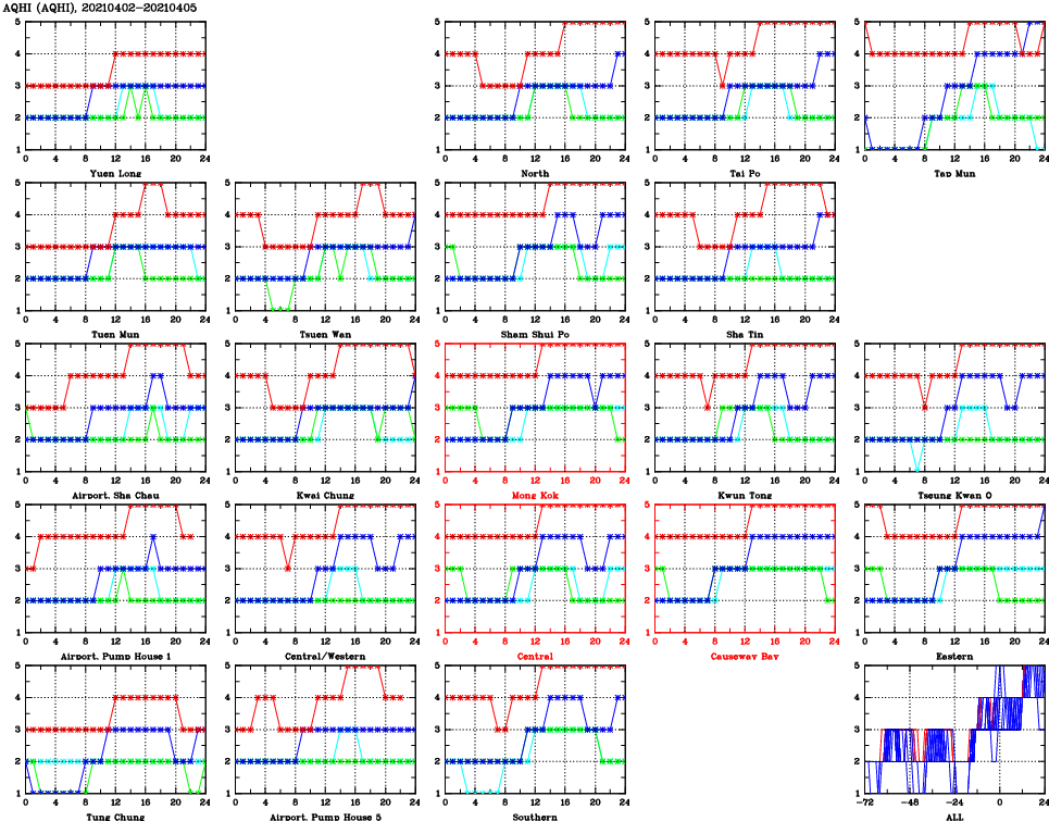 | Air Quality Data Time Series for AQHI (2021/04/05) | ( Line colors: Day -3 Day -2 Day -1 Current day ) | 2D Map Current AQHI |