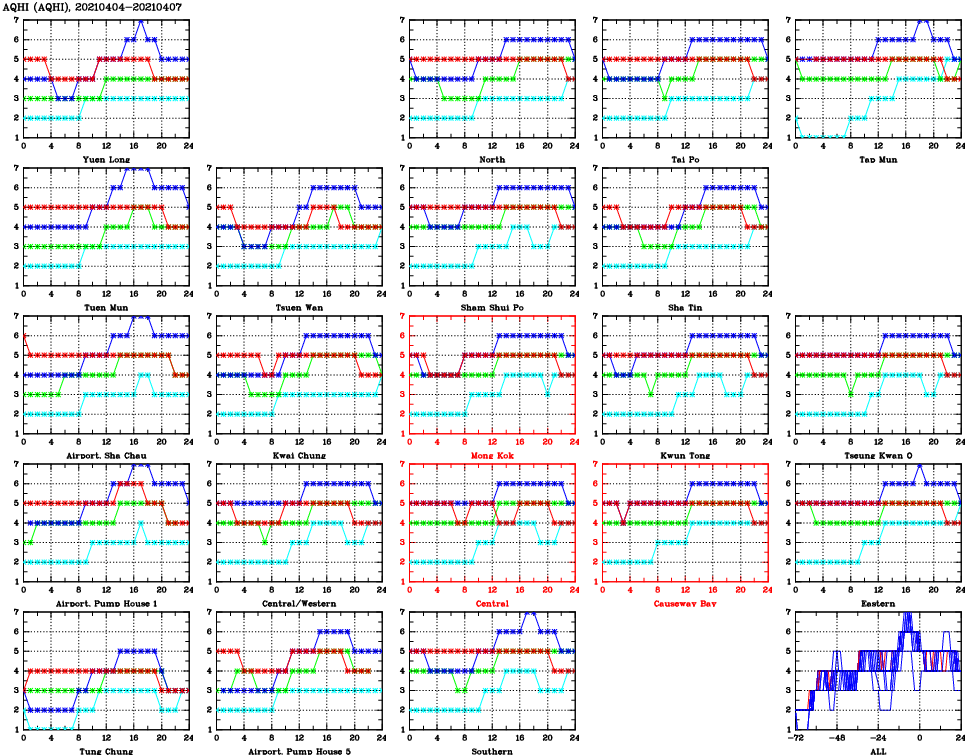 | Air Quality Data Time Series for AQHI (2021/04/07) | ( Line colors: Day -3 Day -2 Day -1 Current day ) | 2D Map Current AQHI |