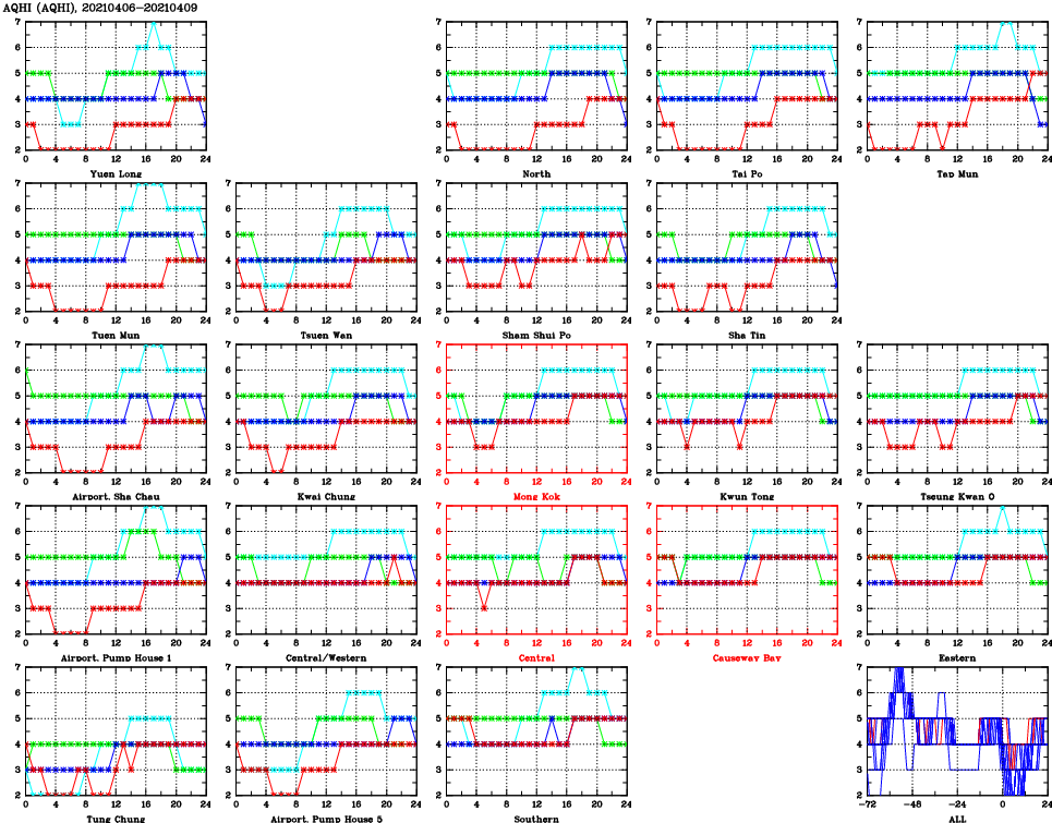 | Air Quality Data Time Series for AQHI (2021/04/09) | ( Line colors: Day -3 Day -2 Day -1 Current day ) | 2D Map Current AQHI |