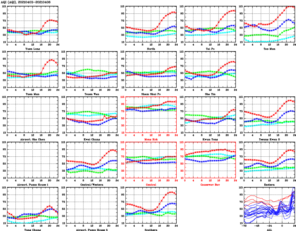 | Air Quality Data Time Series for AQI (2021/04/06) | ( Line colors: Day -3 Day -2 Day -1 Current day ) | 2D Map Current AQHI |