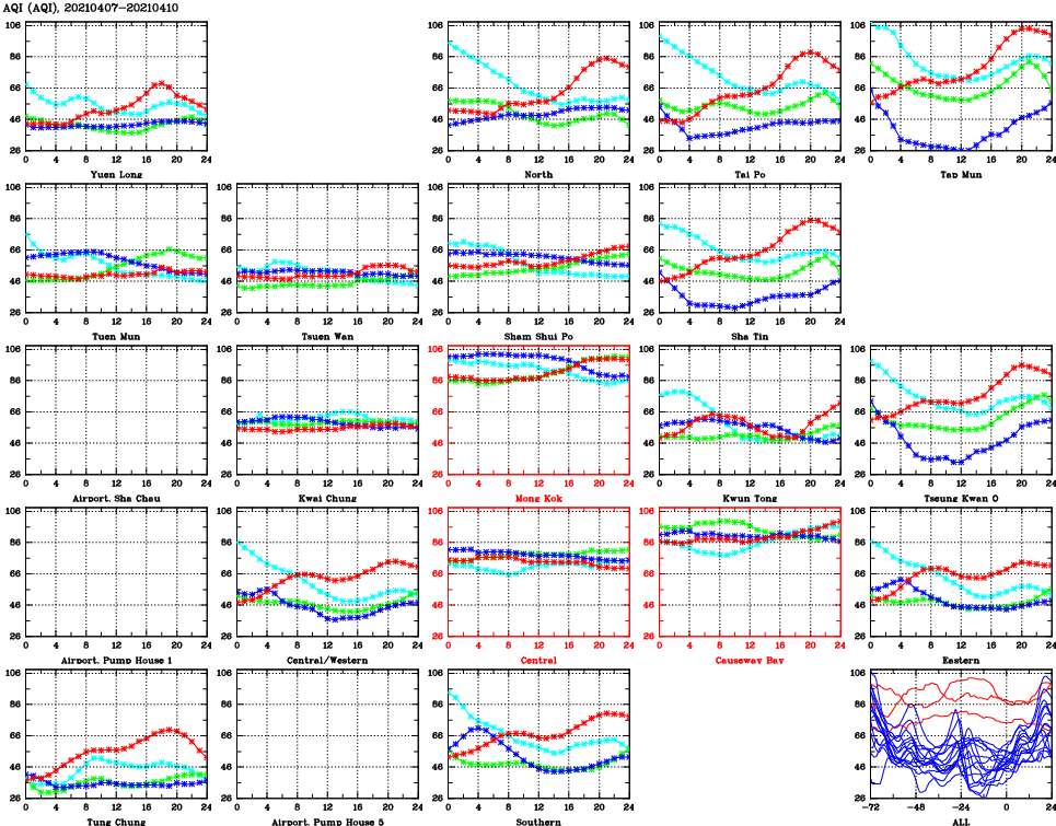 | Air Quality Data Time Series for AQI (2021/04/10) | ( Line colors: Day -3 Day -2 Day -1 Current day ) | 2D Map Current AQHI |