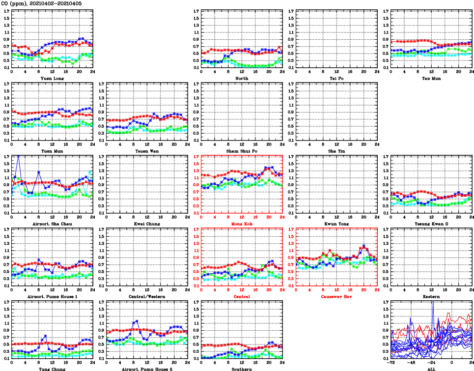 | Air Quality Data Time Series for CO (2021/04/05) | ( Line colors: Day -3 Day -2 Day -1 Current day ) | 2D Map Current AQHI |