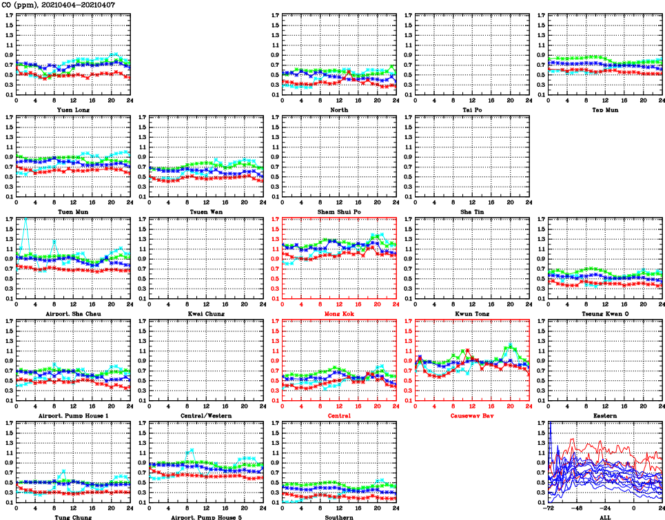 | Air Quality Data Time Series for CO (2021/04/07) | ( Line colors: Day -3 Day -2 Day -1 Current day ) | 2D Map Current AQHI |