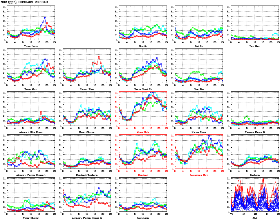 | Air Quality Data Time Series for NO2 (2021/04/11) | ( Line colors: Day -3 Day -2 Day -1 Current day ) | 2D Map Current AQHI |