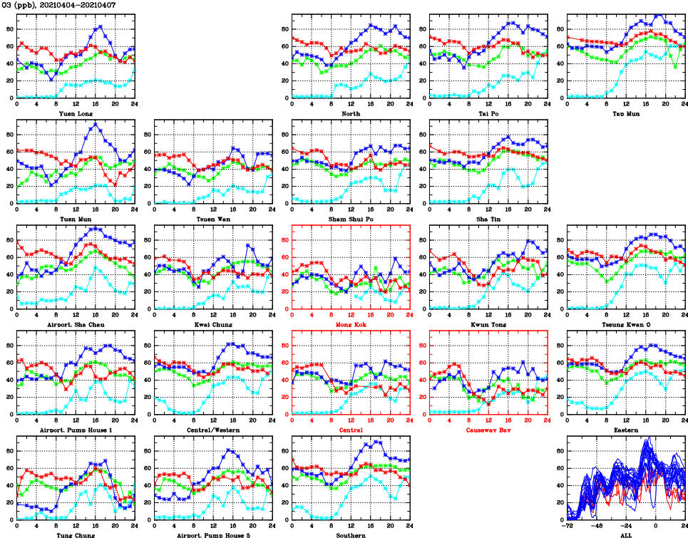 | Air Quality Data Time Series for O3 (2021/04/07) | ( Line colors: Day -3 Day -2 Day -1 Current day ) | 2D Map Current AQHI |