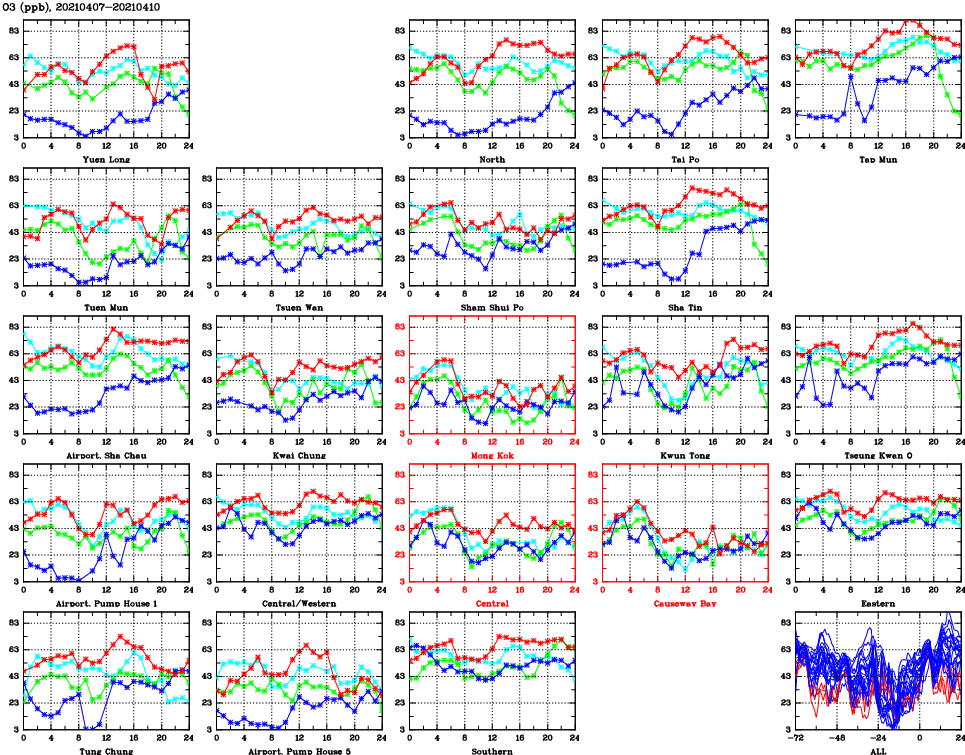 | Air Quality Data Time Series for O3 (2021/04/10) | ( Line colors: Day -3 Day -2 Day -1 Current day ) | 2D Map Current AQHI |