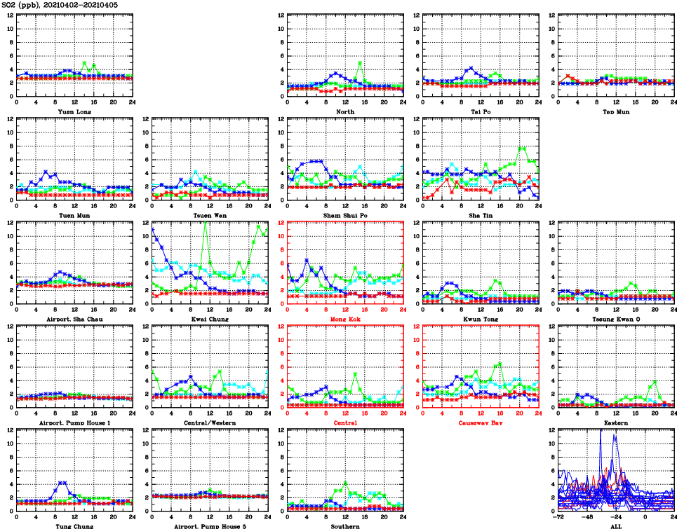 | Air Quality Data Time Series for SO2 (2021/04/05) | ( Line colors: Day -3 Day -2 Day -1 Current day ) | 2D Map Current AQHI |