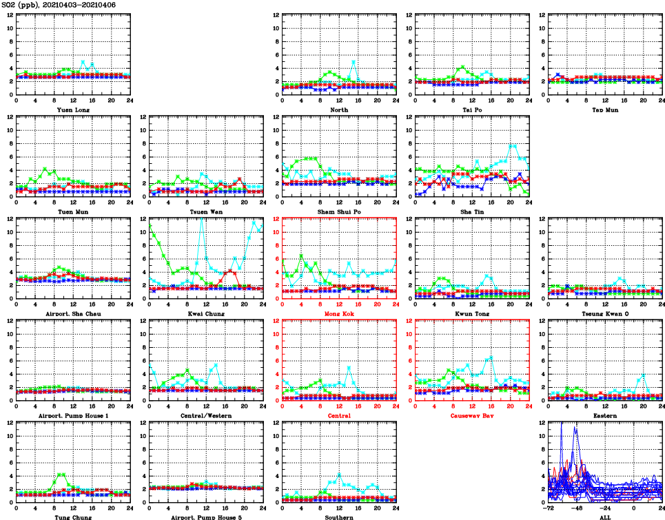 | Air Quality Data Time Series for SO2 (2021/04/06) | ( Line colors: Day -3 Day -2 Day -1 Current day ) | 2D Map Current AQHI |