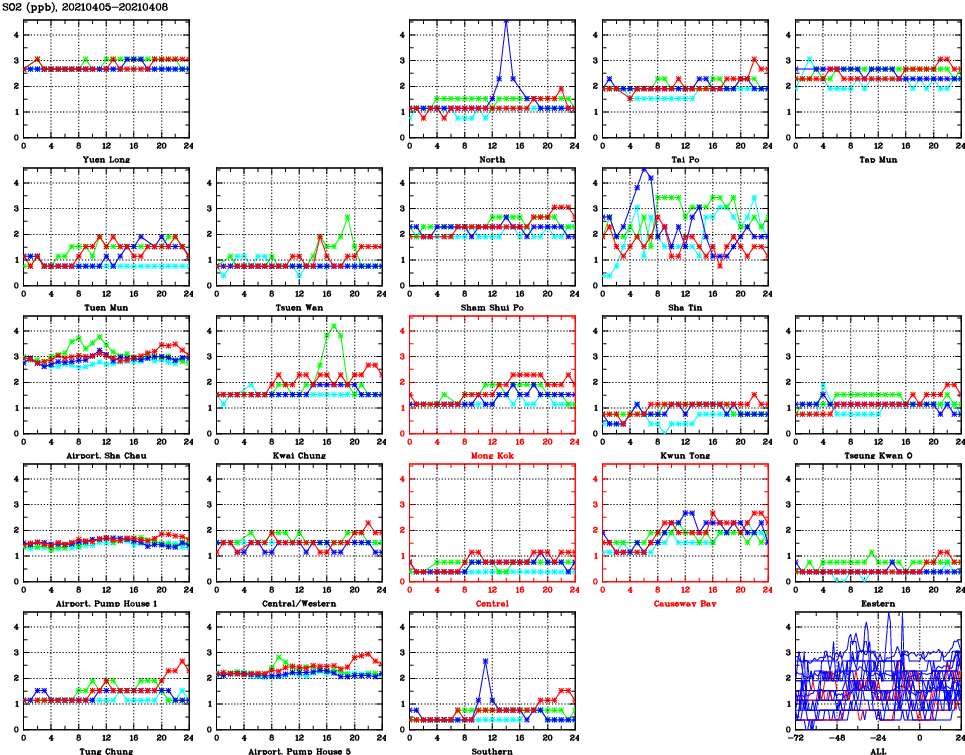 | Air Quality Data Time Series for SO2 (2021/04/08) | ( Line colors: Day -3 Day -2 Day -1 Current day ) | 2D Map Current AQHI |