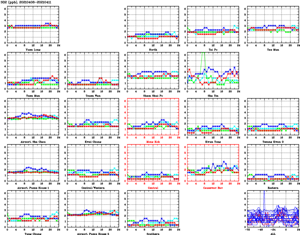 | Air Quality Data Time Series for SO2 (2021/04/11) | ( Line colors: Day -3 Day -2 Day -1 Current day ) | 2D Map Current AQHI |