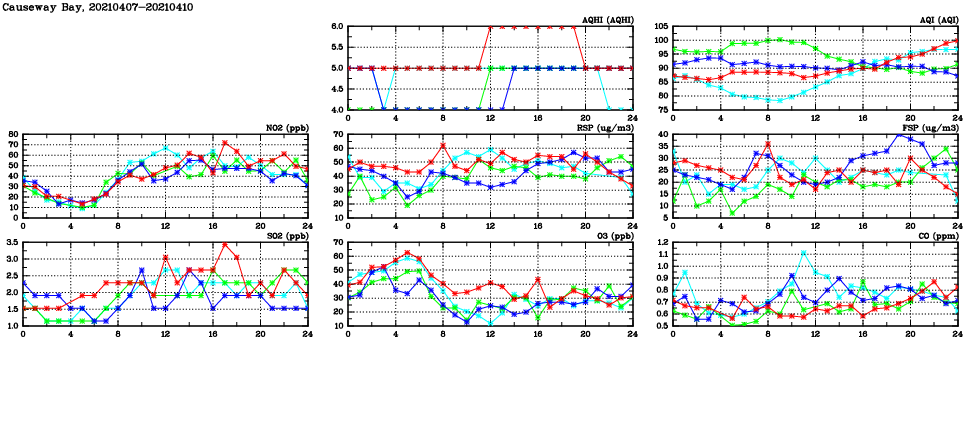 | Air Quality Data Time Series in Causeway Bay (2021/04/10) | ( Line colors: Day -3 Day -2 Day -1 Current day ) | 2D Map Current AQHI |