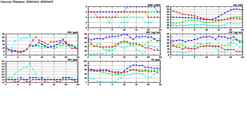| Air Quality Data Time Series in Central/Western (2021/04/07) | ( Line colors: Day -3 Day -2 Day -1 Current day ) | 2D Map Current AQHI |