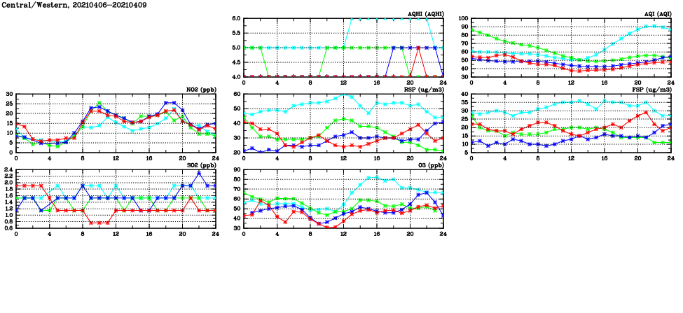 | Air Quality Data Time Series in Central/Western (2021/04/09) | ( Line colors: Day -3 Day -2 Day -1 Current day ) | 2D Map Current AQHI |
