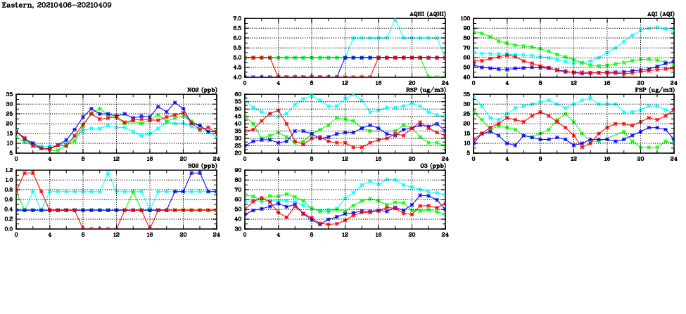 | Air Quality Data Time Series in Eastern (2021/04/09) | ( Line colors: Day -3 Day -2 Day -1 Current day ) | 2D Map Current AQHI |