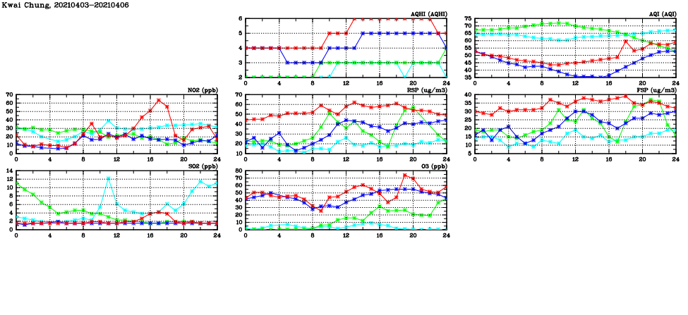| Air Quality Data Time Series in Kwai Chung (2021/04/06) | ( Line colors: Day -3 Day -2 Day -1 Current day ) | 2D Map Current AQHI |