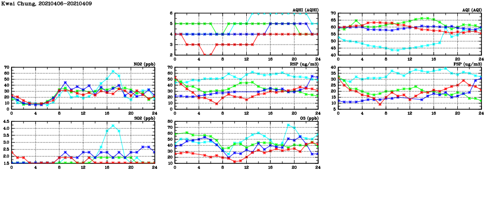 | Air Quality Data Time Series in Kwai Chung (2021/04/09) | ( Line colors: Day -3 Day -2 Day -1 Current day ) | 2D Map Current AQHI |