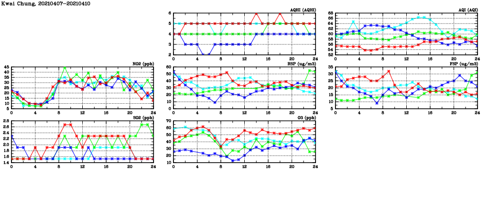 | Air Quality Data Time Series in Kwai Chung (2021/04/10) | ( Line colors: Day -3 Day -2 Day -1 Current day ) | 2D Map Current AQHI |