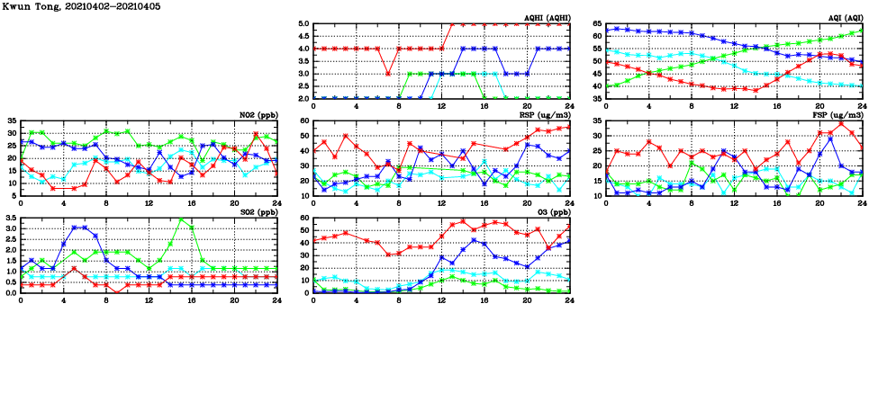 | Air Quality Data Time Series in Kwun Tong (2021/04/05) | ( Line colors: Day -3 Day -2 Day -1 Current day ) | 2D Map Current AQHI |