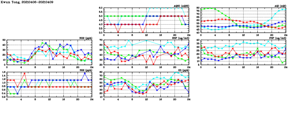 | Air Quality Data Time Series in Kwun Tong (2021/04/09) | ( Line colors: Day -3 Day -2 Day -1 Current day ) | 2D Map Current AQHI |