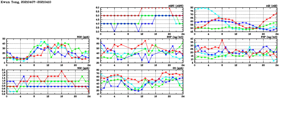 | Air Quality Data Time Series in Kwun Tong (2021/04/10) | ( Line colors: Day -3 Day -2 Day -1 Current day ) | 2D Map Current AQHI |