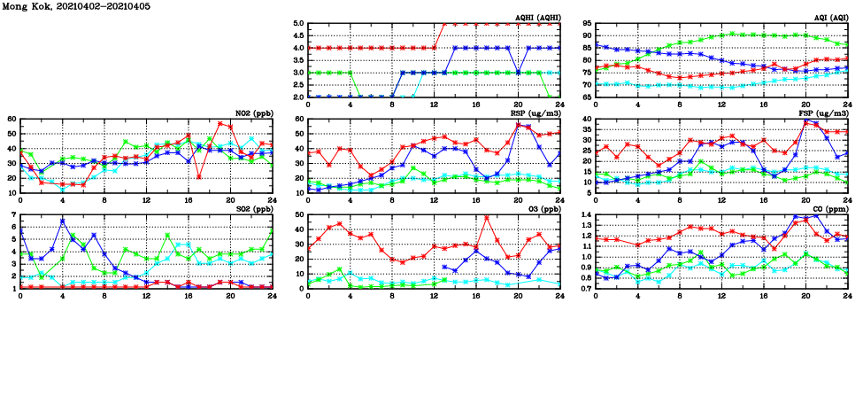 | Air Quality Data Time Series in Mong Kok (2021/04/05) | ( Line colors: Day -3 Day -2 Day -1 Current day ) | 2D Map Current AQHI |