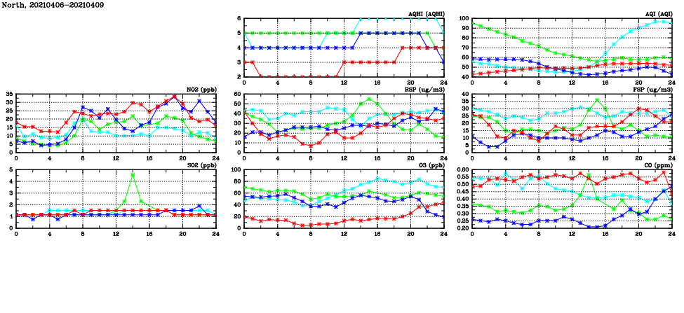 | Air Quality Data Time Series in North (2021/04/09) | ( Line colors: Day -3 Day -2 Day -1 Current day ) | 2D Map Current AQHI |