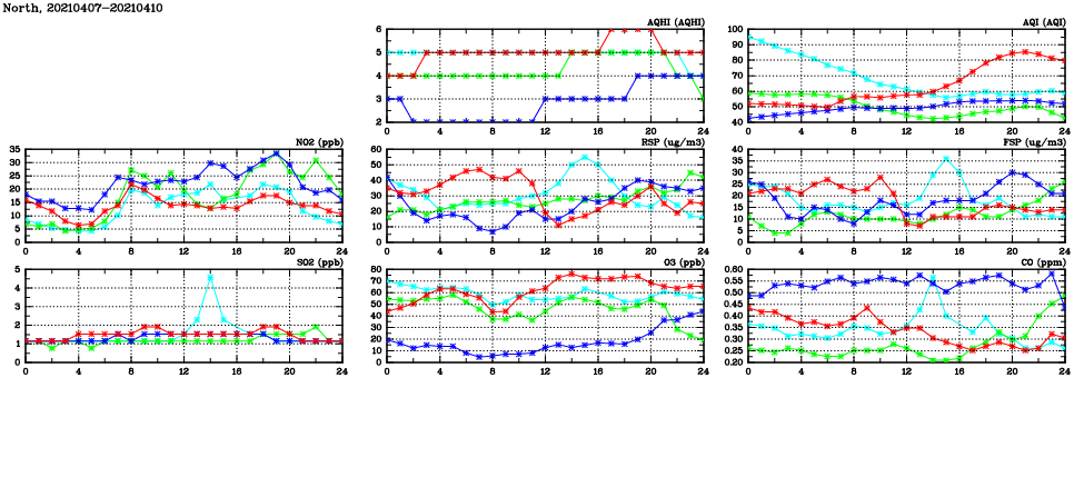 | Air Quality Data Time Series in North (2021/04/10) | ( Line colors: Day -3 Day -2 Day -1 Current day ) | 2D Map Current AQHI |