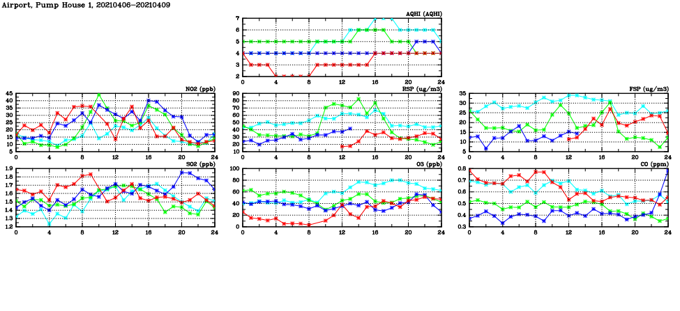 | Air Quality Data Time Series in Airport, Pump House 1 (2021/04/09) | ( Line colors: Day -3 Day -2 Day -1 Current day ) | 2D Map Current AQHI |