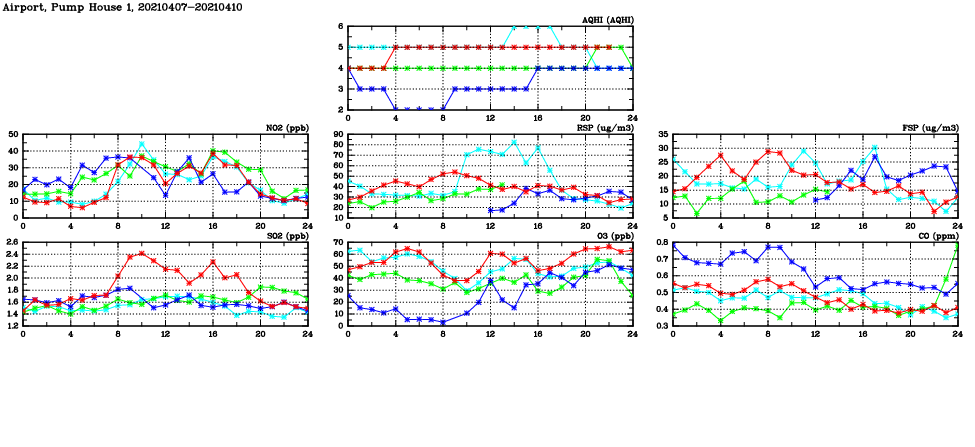 | Air Quality Data Time Series in Airport, Pump House 1 (2021/04/10) | ( Line colors: Day -3 Day -2 Day -1 Current day ) | 2D Map Current AQHI |