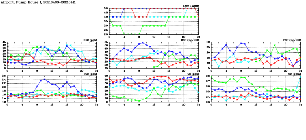 | Air Quality Data Time Series in Airport, Pump House 1 (2021/04/11) | ( Line colors: Day -3 Day -2 Day -1 Current day ) | 2D Map Current AQHI |