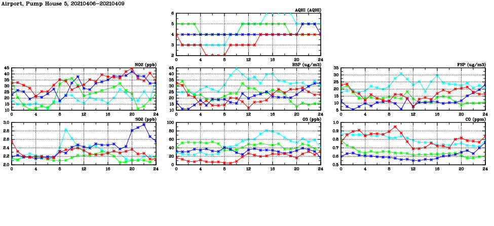 | Air Quality Data Time Series in Airport, Pump House 5 (2021/04/09) | ( Line colors: Day -3 Day -2 Day -1 Current day ) | 2D Map Current AQHI |