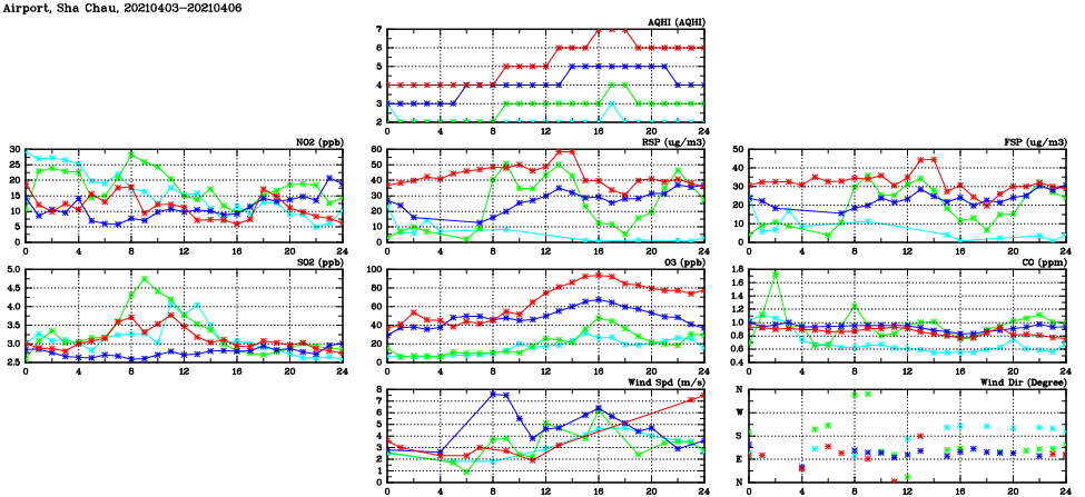 | Air Quality Data Time Series in Airport, Sha Chau (2021/04/06) | ( Line colors: Day -3 Day -2 Day -1 Current day ) | 2D Map Current AQHI |