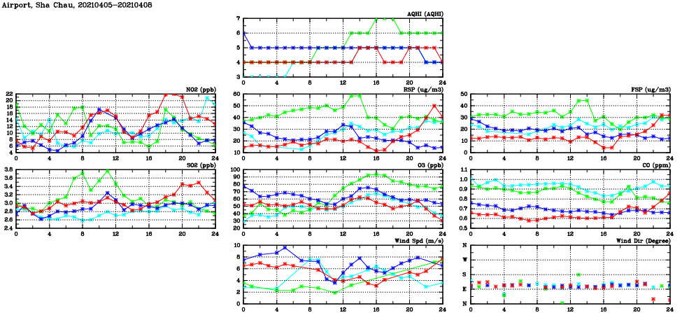 | Air Quality Data Time Series in Airport, Sha Chau (2021/04/08) | ( Line colors: Day -3 Day -2 Day -1 Current day ) | 2D Map Current AQHI |