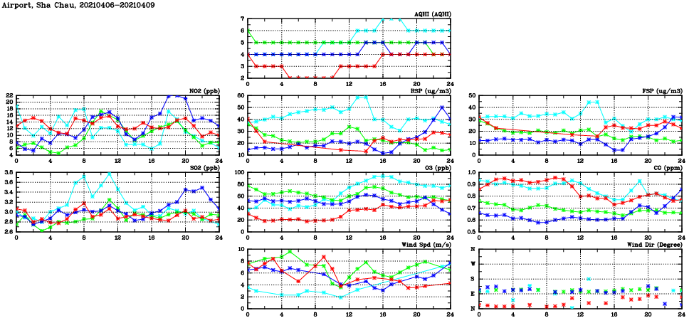 | Air Quality Data Time Series in Airport, Sha Chau (2021/04/09) | ( Line colors: Day -3 Day -2 Day -1 Current day ) | 2D Map Current AQHI |