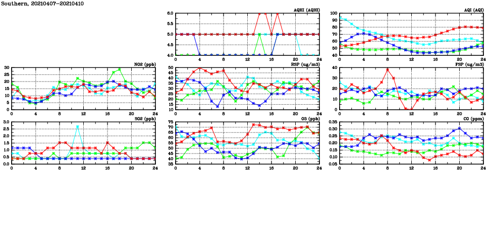 | Air Quality Data Time Series in Southern (2021/04/10) | ( Line colors: Day -3 Day -2 Day -1 Current day ) | 2D Map Current AQHI |