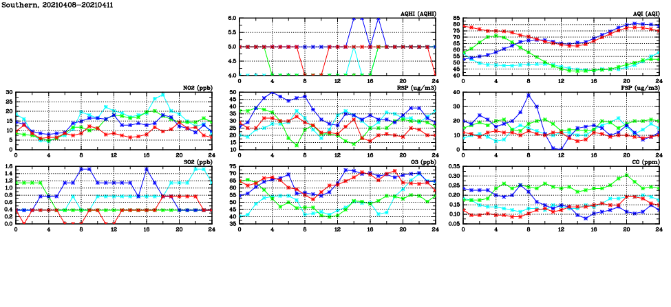 | Air Quality Data Time Series in Southern (2021/04/11) | ( Line colors: Day -3 Day -2 Day -1 Current day ) | 2D Map Current AQHI |