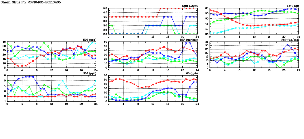 | Air Quality Data Time Series in Sham Shui Po (2021/04/05) | ( Line colors: Day -3 Day -2 Day -1 Current day ) | 2D Map Current AQHI |
