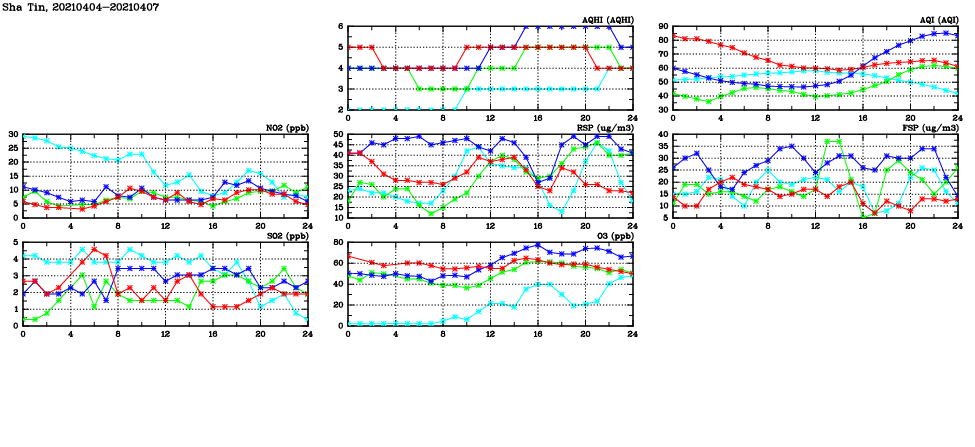 | Air Quality Data Time Series in Sha Tin (2021/04/07) | ( Line colors: Day -3 Day -2 Day -1 Current day ) | 2D Map Current AQHI |
