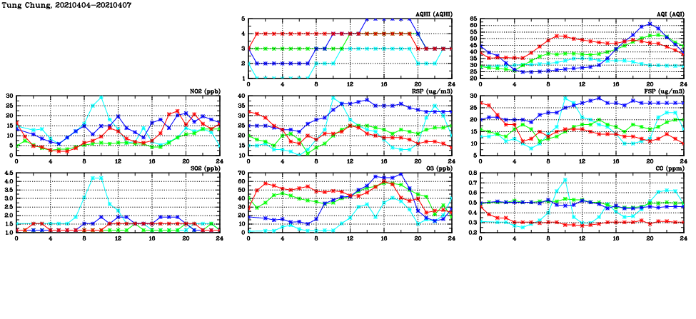 | Air Quality Data Time Series in Tung Chung (2021/04/07) | ( Line colors: Day -3 Day -2 Day -1 Current day ) | 2D Map Current AQHI |