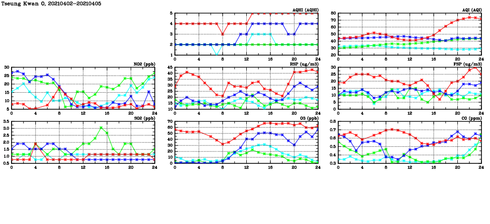 | Air Quality Data Time Series in Tseung Kwan O (2021/04/05) | ( Line colors: Day -3 Day -2 Day -1 Current day ) | 2D Map Current AQHI |