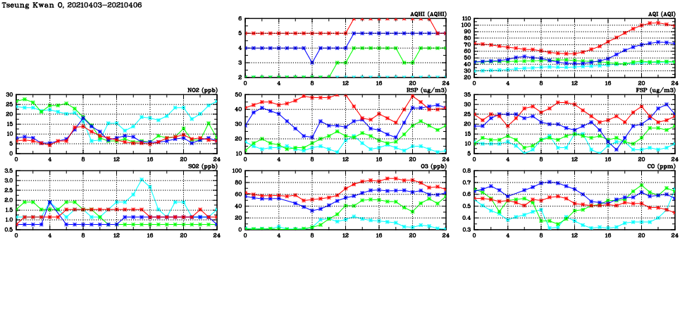 | Air Quality Data Time Series in Tseung Kwan O (2021/04/06) | ( Line colors: Day -3 Day -2 Day -1 Current day ) | 2D Map Current AQHI |