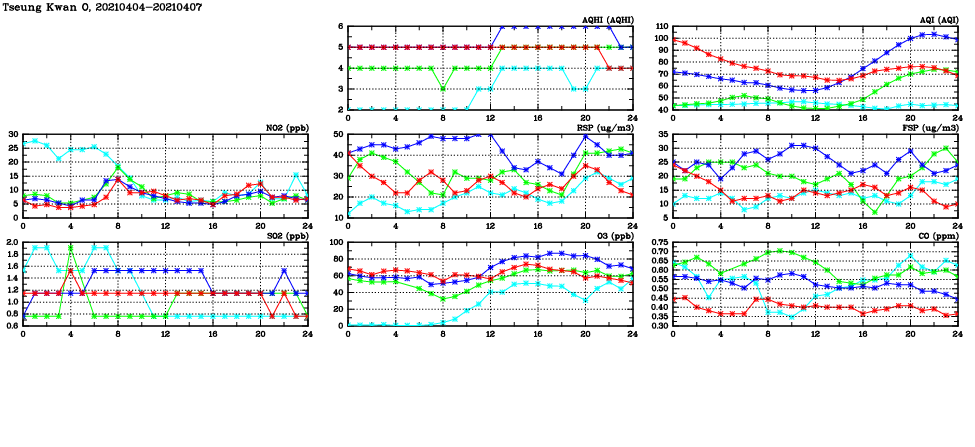 | Air Quality Data Time Series in Tseung Kwan O (2021/04/07) | ( Line colors: Day -3 Day -2 Day -1 Current day ) | 2D Map Current AQHI |