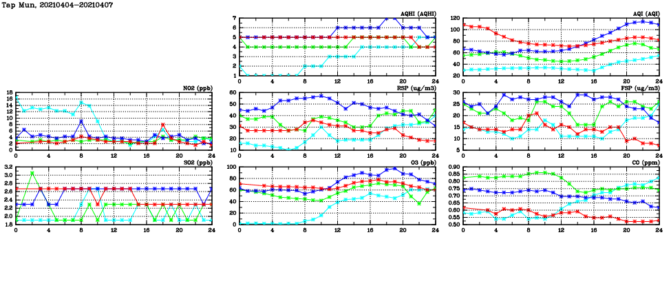 | Air Quality Data Time Series in Tap Mun (2021/04/07) | ( Line colors: Day -3 Day -2 Day -1 Current day ) | 2D Map Current AQHI |