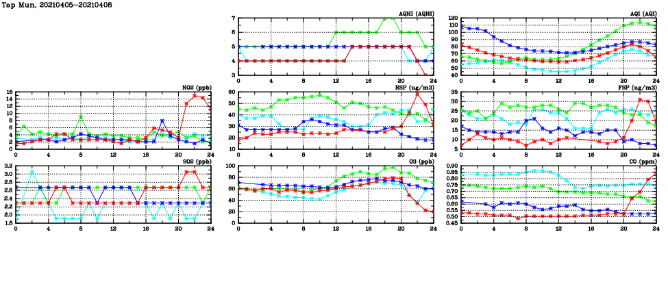 | Air Quality Data Time Series in Tap Mun (2021/04/08) | ( Line colors: Day -3 Day -2 Day -1 Current day ) | 2D Map Current AQHI |