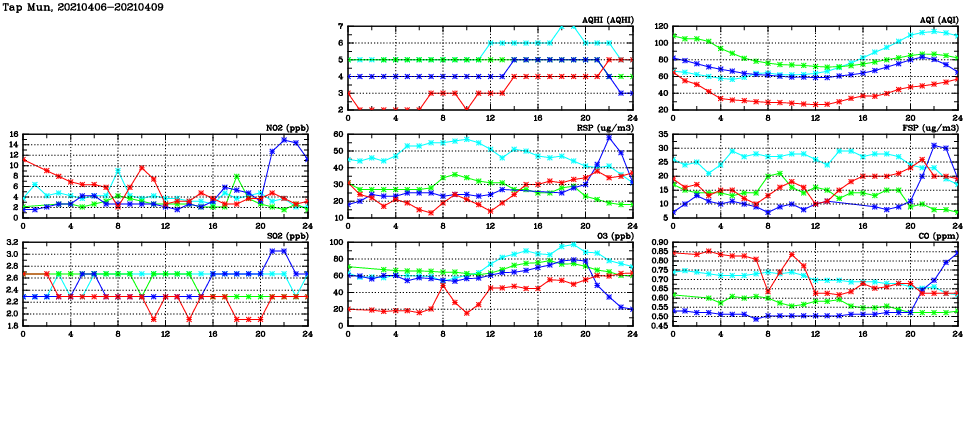 | Air Quality Data Time Series in Tap Mun (2021/04/09) | ( Line colors: Day -3 Day -2 Day -1 Current day ) | 2D Map Current AQHI |