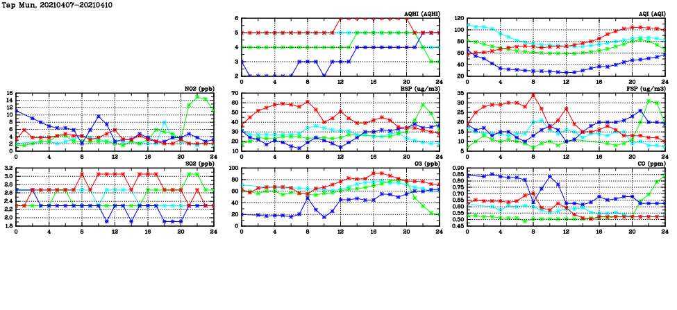 | Air Quality Data Time Series in Tap Mun (2021/04/10) | ( Line colors: Day -3 Day -2 Day -1 Current day ) | 2D Map Current AQHI |